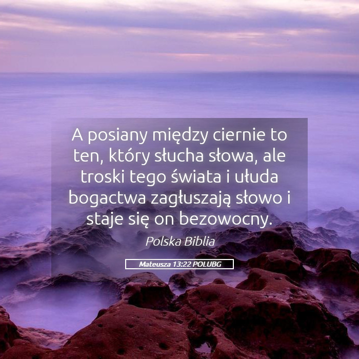 „A ten, który jest posiany między ciernie, to ten, który słucha słowa, ale troska tego świata i zwodniczość bogactwa zagłuszają słowo, i staje się bezowocny.”